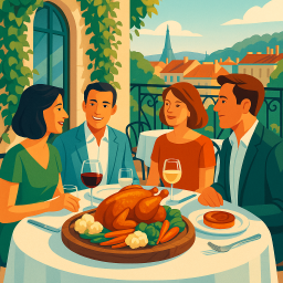 * Peter can now enjoy the dinner with his friends at La Villa Borgo - Hôtel Restaurant Champagne-au-Mont-d'Or!